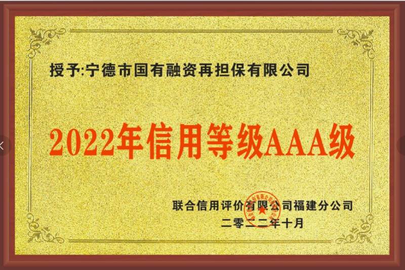 近日,联合信用评价有限公司通过对宁德市国有融资再担保有限公司(以下简称公司)的业务环境、管理素质、风险控制、代偿能力、经营情况等方面进行综合分析和评估。评定公司2022年度信用等级为AAA,是全省(不含厦门市)首家获得AAA等级的市级担保公司。